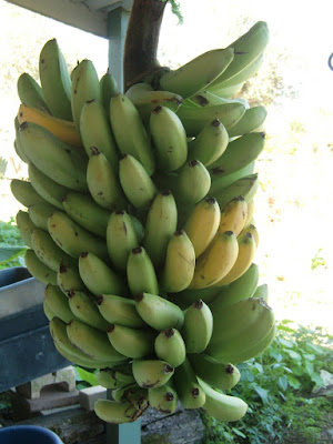 Too heavy for the small trees, we had to prop some up. The first two broke the stems of the tress and had to be harvested right then. So we hung them on the back veranda and watched. Now they are getting yellow-ish. A few bananas, ahead of the others, got quite yellow and I carefully extracted them from the bunch, to try them. I was surprised to find them quite flavourful.